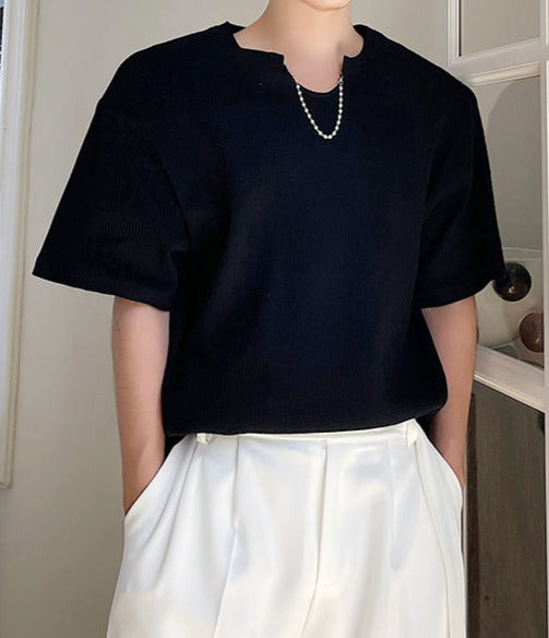 ティアドロップネック ワッフル ハーフスリーブ ニット