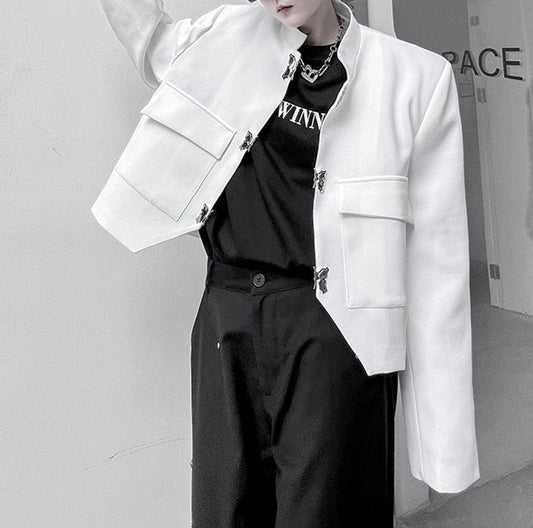 【秋物コーデ3点セット】 ①白ショートJKT・②長袖Tシャツ・③黒パンツ