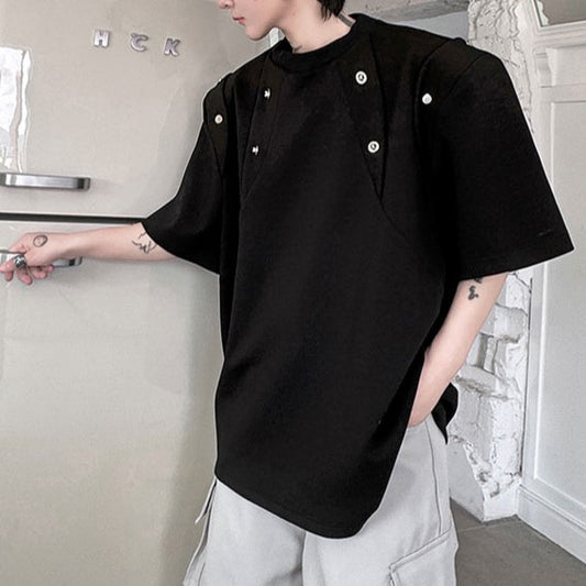 メタルボタンデザイン パッドショルダー ハーフスリーブTシャツ
