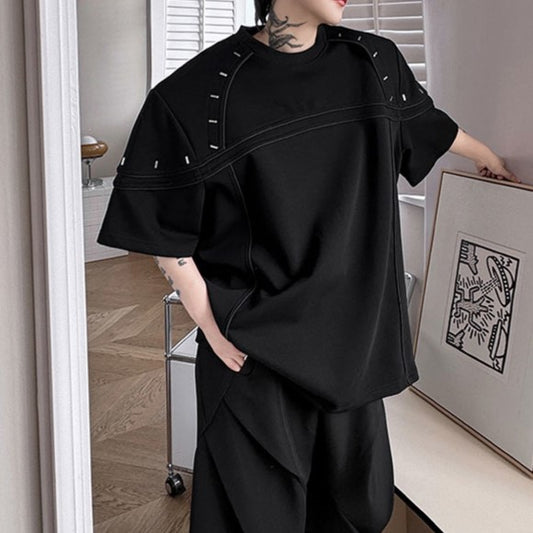 メタルピンリベット パッドショルダー ハーフスリーブTシャツ